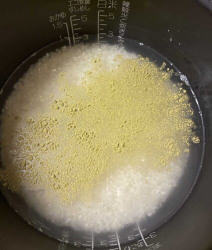 そこに松葉茶の粉を小さじ半分〜1杯入れて軽く混ぜて炊くだけです。